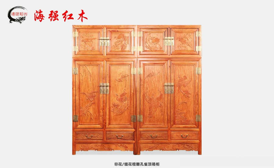 檀雕孔雀頂箱柜